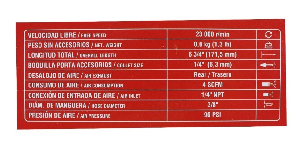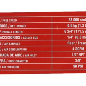 Su diseño ergonómico y ligero, con un peso de solo 500 g, permite un manejo cómodo y prolongado, reduciendo la fatiga durante su uso. La alimentación neumática asegura un rendimiento constante y eficiente, mientras que su presión de trabajo de 90 psi optimiza su funcionamiento en diferentes entornos de trabajo.